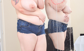 Busty Roxanne Miller attack a targetdisc. After feed her baby, she paint a targetdisc with lipstick on the big mirror and attack it with the leftover milk in her fluffy big boobs.